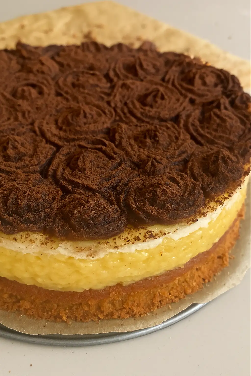 - Backen: Stellen Sie die Form in den vorgeheizten Ofen und backen Sie den Kuchen für etwa 50-55 Minuten, bis er goldbraun ist und ein Zahnstocher, der in die Mitte gesteckt wird, sauber herauskommt. Falls der Kuchen zu schnell braun wird, decken Sie ihn mit Backpapier ab.